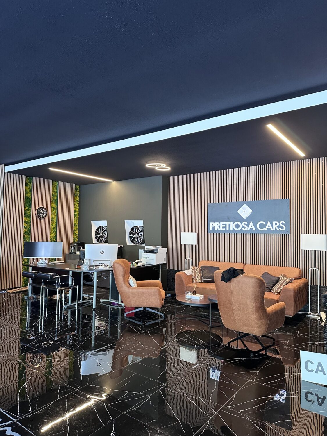 Der Auftraggeber hatte eine klare Vorstellung: Ein Showroom, der Luxus ausstrahlt, ohne überladen zu wirken. Ein Raum, der die Hochwertigkeit der präsentierten Produkte – in diesem Fall hochwertige Fahrzeuge – unterstreicht und gleichzeitig eine einladende Atmosphäre schafft.